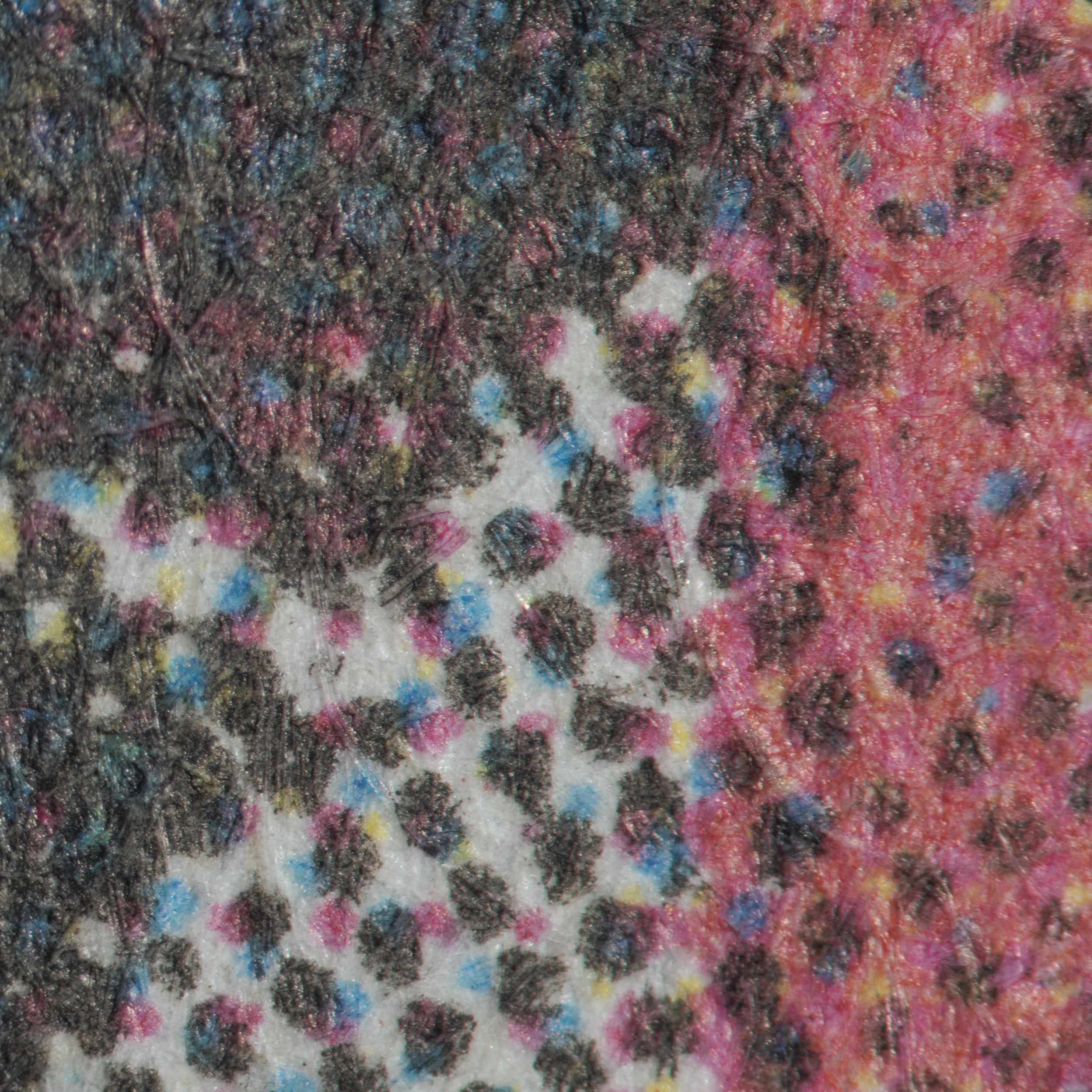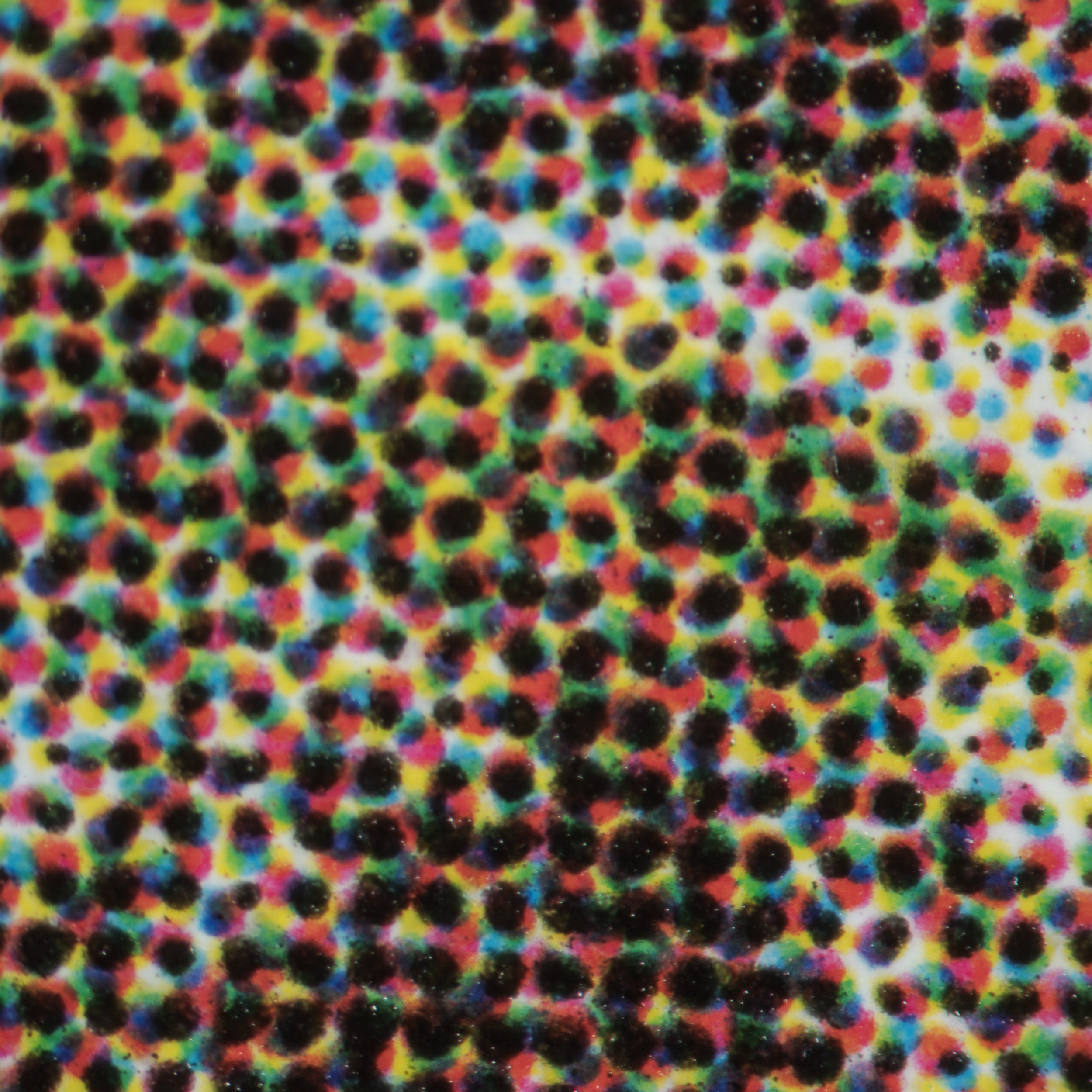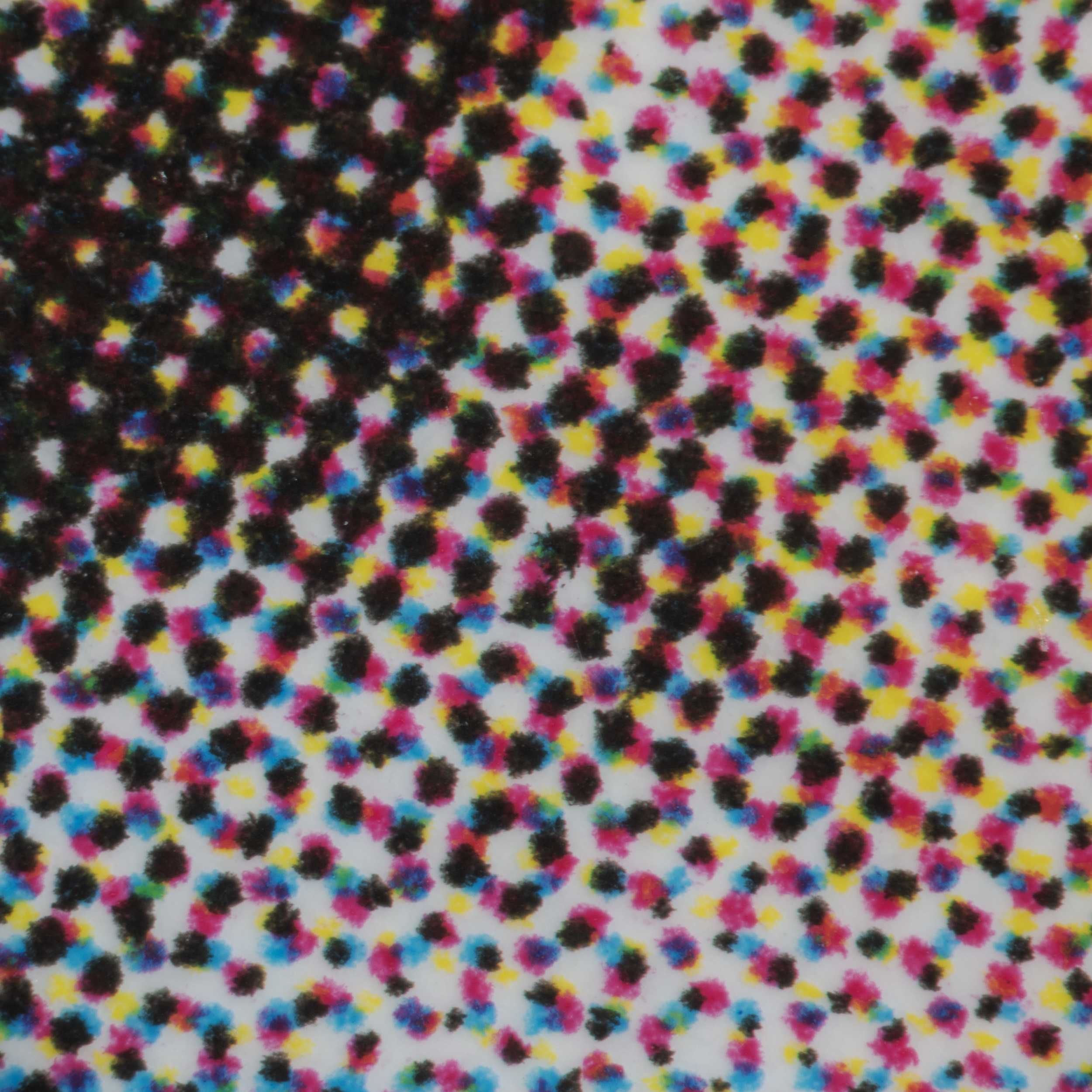 Dit is de moderne digitale versie van het drukwerk. Het detail komt van de omslag van een fotoboekje dat hoogst waarschijnlijk op een HP Indigo digitale drukpers is gemaakt. Het raster lijkt heel erg op dat van klassiek drukwerk voor een tijdschrift maar er zijn wel subtiele verschillen. In de praktijk is bij het gewoon bekijken van het drukwerk het verschil niet te zien behalve misschien voor echte specialisten.