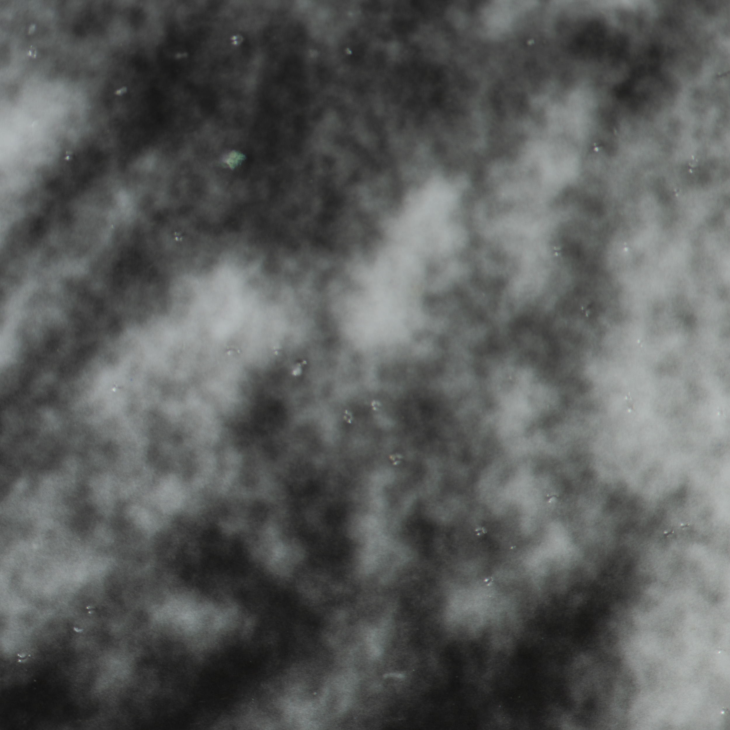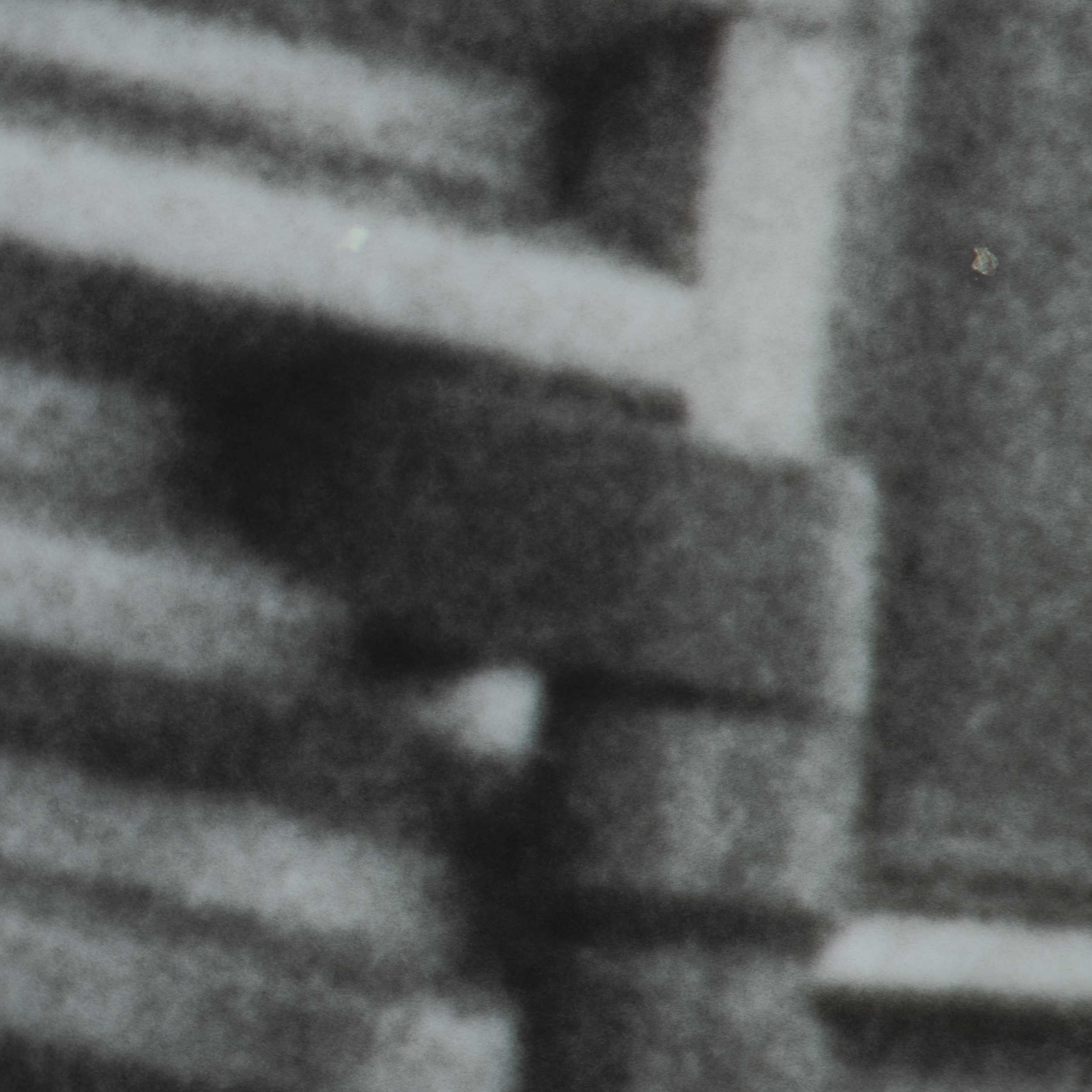 Het detail hieronder is een klein stukje van een echte foto, afgedrukt op PE papier. Dat is het sneldrogende fotopapier waarbij beide zijden van het papier zijn voorzien van een laag Polyethyleen, plastic. De fotografische emulsie is een heel dunne laag op het plastic. Het voordeel van het materiaal is dat het heel snel te verwerken valt, slechts kort spoelen is nodig, en het droogt ook heel snel. Het origineel is een 25 cm brede afdruk van een 6x12 zwartwit negatief. De afdruk ziet er prachtig scherp uit. Maar wanneer je iets maar ver genoeg vergroot zie je dat niet meer. De vage structuur die zichtbaar is wordt gevormd door de korrelstructuur van de film.
