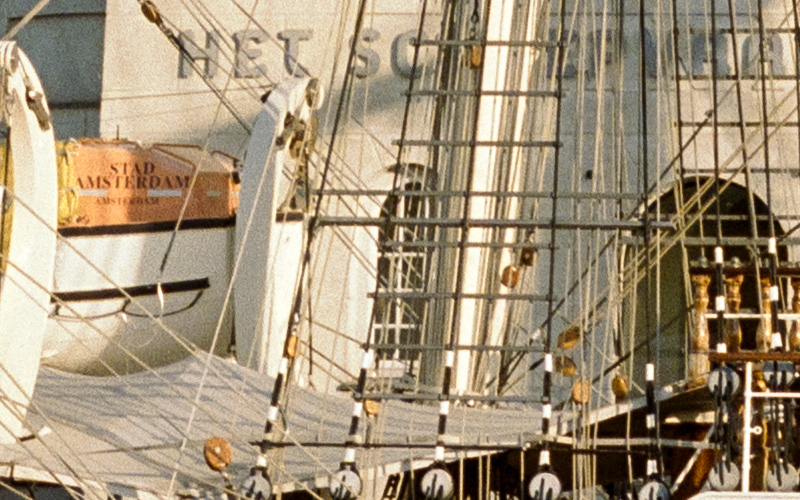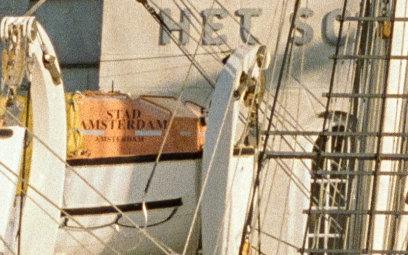 Het is weliswaar een beetje werk, maar toch heel eenvoudig om een 6x6 origineel in twee deelopnames vast te leggen, gewoon door het negatief op te schuiven en twee helften met overlap op te nemen. De camera wordt dan zo ingesteld dat de breedte van sensor keurig de breedte van de fim vastlegt. In Lightroom of Camera RAW zijn die twee opnames dan eenvoudig samen te voegen tot één bestand dat dan 8200 x 8200 pixels meet. 70 x 70 cm als je het afdrukt. Maar wanneer je kijkt naar beide bestanden zie je dat de korrelstructuur wel duidelijker is vastgelegd, maar de foto zelf is er niet scherper van geworden. Voor mij is het al een beetje overbodig groot. Verscherpen met de Topaz software kan soms nog wel wat extra detail opleveren, zeker bij teksten of duidelijk herkenbare structuren zoals bakstenen.