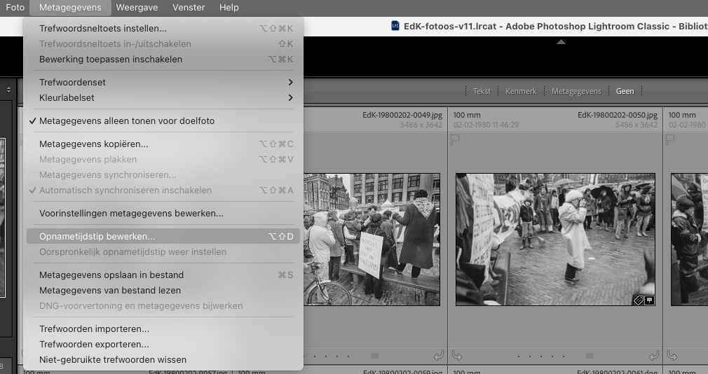 De plaats in het menu van Lightroom waar je de optie vindt ligt voor de hand, ‘metagegevens’, en daaronder de keuze ‘Opnametijdstip bewerken...’. De toetscombinatie die er achter staat in het menu is er één die ik zelf heb toegevoegd, dat is handig wanneer je het vaak wilt doen.