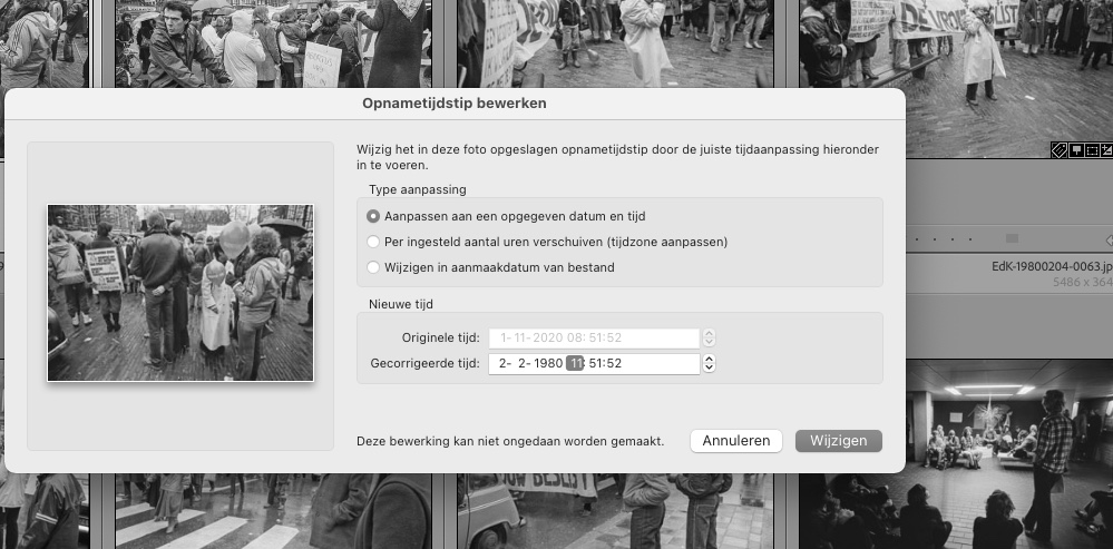 Bij het reproduceren van negatieven en dia’s krijgen de bestanden vanuit de camera automatisch de datum mee waarop je die reproductie hebt gemaakt. Wanneer je echter de datum belangrijk vindt waarop de oorspronkelijke foto gemaakt is en die datum echt onderdeel van het bestand wilt maken dan moet je die datum die is weggeschreven in de EXIF-informatie wijzigen. Dat kan niet in elk programma, het kan bijvoorbeeld niet gedaan worden in de bestandsinformatie van Photoshop. Het kan wel in Lightroom en Bridge, als je dat wilt ook voor hele reeksen foto’s tegelijk als ze op dezelfde dag gemaakt zijn.