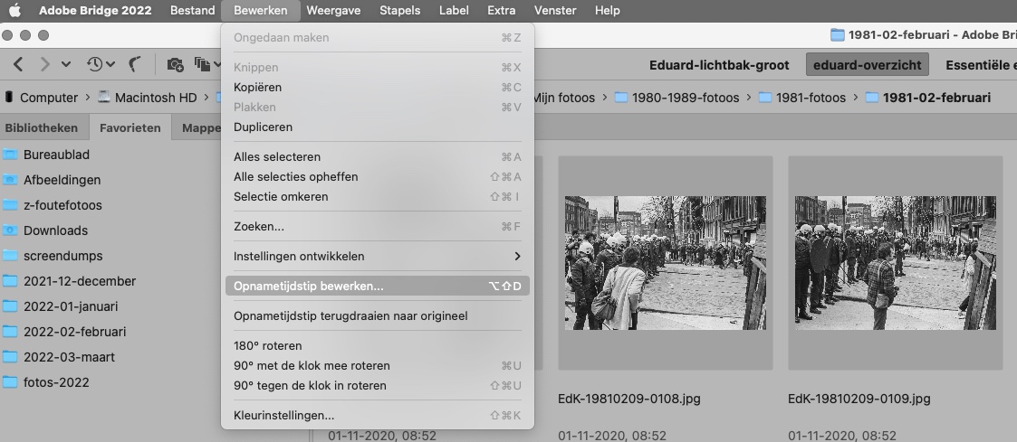 Het aanpassen van de opnamedatum verloopt in Bridge vrijwel op dezelfde manier. Alleen vindt je de optie hier onder het menu ‘Bewerken.’. De keuze eronder heeft precies dezelfde naam als in Lightroom: ‘Opnametijdstip bewerken...’. Dat is ook de reden dat de computer er bij mij dezelfde toetscombinatie aan toegekend heeft.