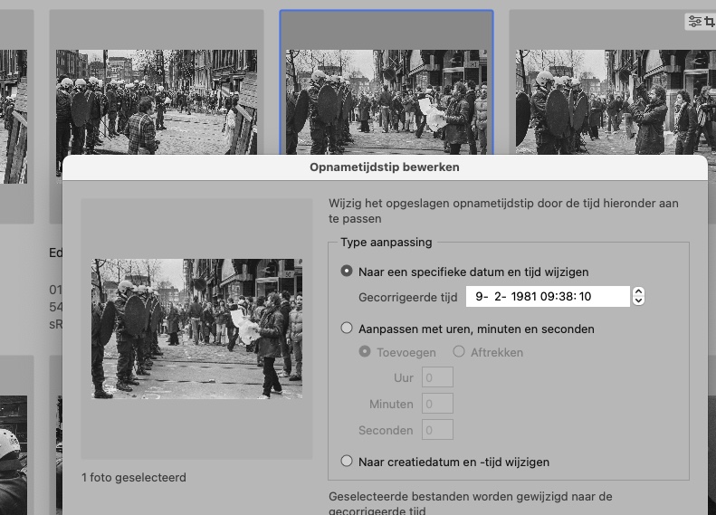 In het venster dat dan op je scherm verschijnt kun je die datum op verschillende manieren aanpassen. Een optie is om alle data op te schuiven, bijvoorbeeld als de klok van je camera een uur of een dag verkeerd stond terwijl je fotografeerde. Maar voor de reproducties is alleen de keuze voor ‘Aanpassen aan een opgegeven datum en tijd’ zinvol. Daarbij sla ik de tijd altijd over, daar wordt maar nauwelijks naar gekeken. Maar als je een serie foto’s wilt sorteren in een gewenste volgorde kun je ze elk een net iets eerder of later tijdstip toewijzen, dat werk goed bij het sorteren ook al kijkt er nooit iemand naar.