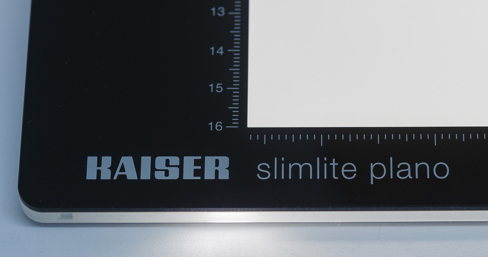 Bij de slimlite plano van Kaiser komt mijn Sekonic C-700 tot een waarde van 95, precies de door Kaiser aangegeven waarde in de productinformatie. Kijk je naar meer dan de oude acht standaardkleuren die onderdeel zijn van de CRI-standaard dan zie je wel het typische LED-probleem: rood en donkerblauw worden iets minder goed gereproduceerd. Maar ik denk wel voldoende voor normale reproductie. Wanneer je denkt dat in het resultaat bij diareproductie te zien, dan zou je een kleine kleurcorrectie kunnen toepassen die je op alle reproducties loslaat. Tenslotte is er natuurlijk het voor reproduceren heel belangrijke aspect: de gelijkmatigheid van de verlichting. Omdat de rij LED’s aan één kant zit is er door de fabrikant een behoorlijk geslaagd kunststukje uitgehaald om toch een gelijkmatig verlicht vlak te krijgen. Er is uiteindelijk wel verschil in de helderheid tussen verschillende delen van het witte vlak, maar het is niet groot. Aan de randen wordt het verschil wel wat groter waardoor de kleinste maat slimline voor bijvoorbeeld 4x5 inch als egale lichtbron wel iets tekort gaat komen. Hoewel ik denk dat je het pas ziet wanneer je het contrast flink moet opvoeren in de beeldbewerking achteraf. Maar voor de kleinere afmetingen is het centrum egaal genoeg lijkt me.